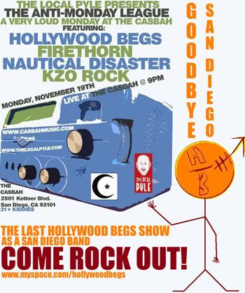 It was the best of times, it was the worst- no, it was just the best. Hollywood Begs played our last show as a San Diego band at the Casbah on Monday, November 19th with Firethorn, Nautical Disaster and KZO Rock. A wonderful night is an understatement becuase a ton of people showed up (ON A MONDAY!) and all the bands were at their best.